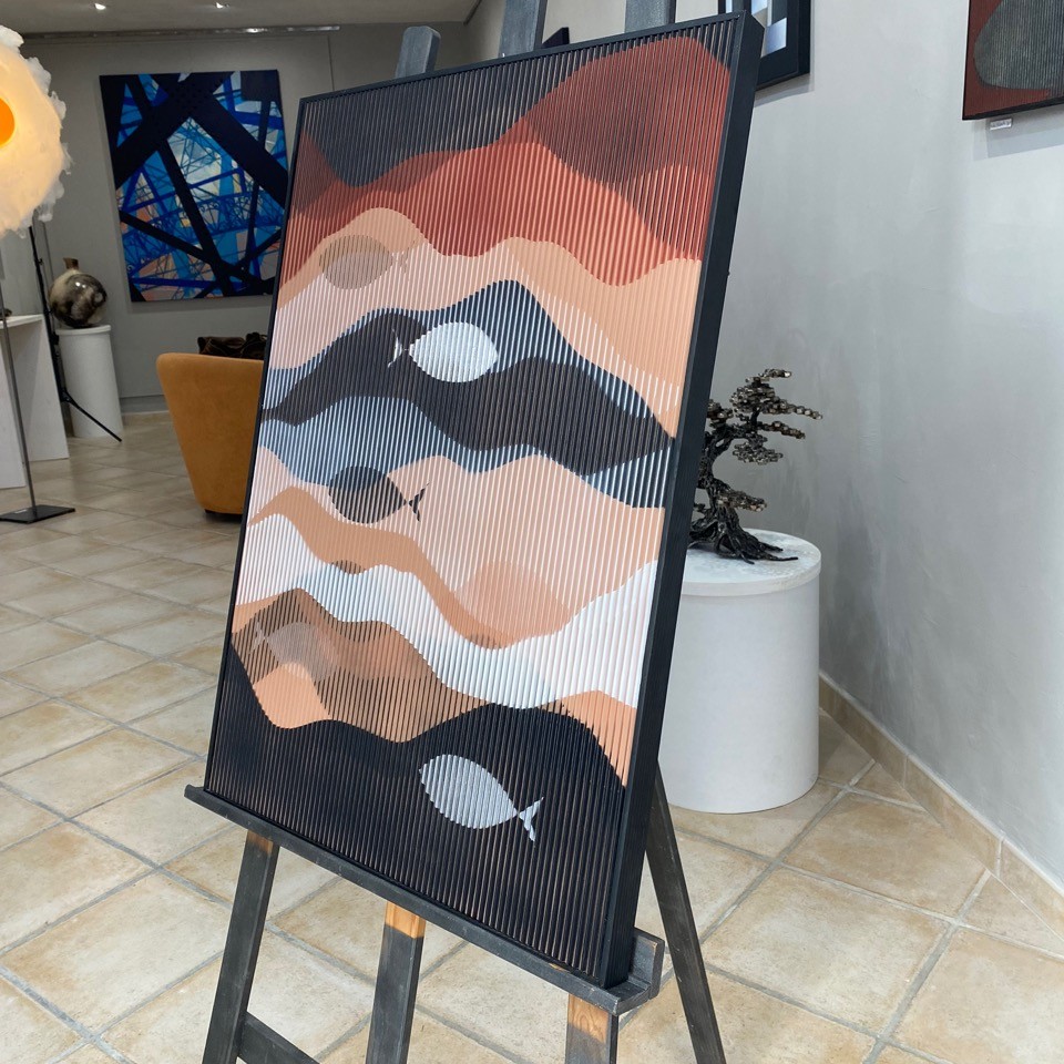 For his novel collection the artist RocheColombe explores a unique form of undulatory art, where corrugated surfaces become living fields of expression. Blending art, design, and innovation, each piece shifts with light and movement, creating a subtle interplay between form and perception. RocheColombe invites the viewer into a fluid visual experience, where motion awakens emotion and transforms the act of seeing into a moment of discovery. Come and visit or gallery in Montélimar in Drôme provencale.